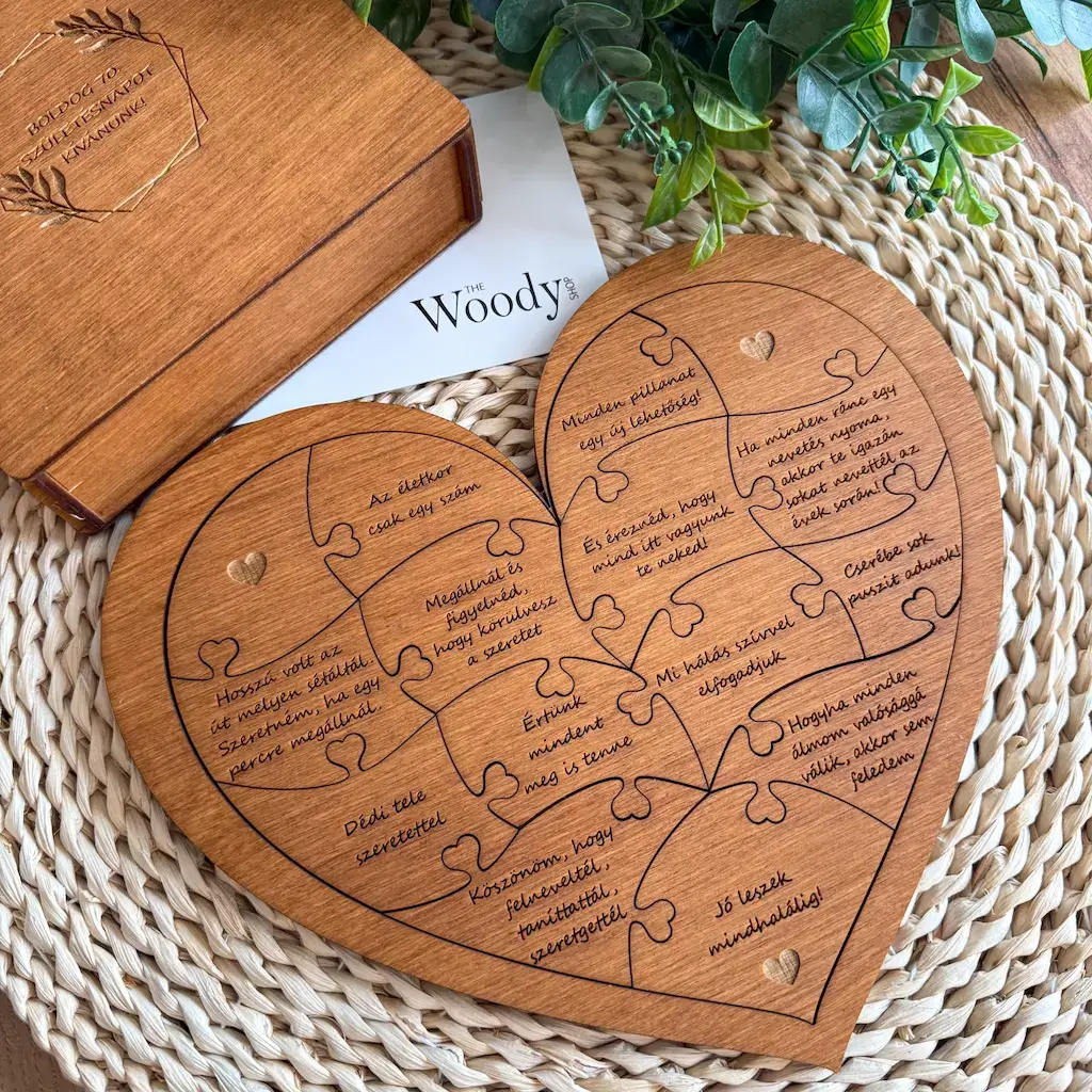 A szívecske illesztésű, gravírozott fa puzzle darabok elmondják szíved minden titkos üzenetét szerettednek, melyet együtt fedezhettek fel kirakás közben.